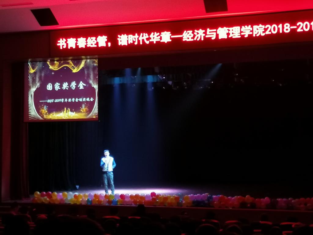接下来主持人宣读2018-2019学年经管学院学业奖学金获得者名单,优秀学生代表王玥清、裴鑫上台和同学们分享了学习经验和对于大学生活的理解,给低年级的同学们带来很大的启发,让同学们明白应以学习为本,以兴趣为辅。大学是对知识和真理的追求,是面对挫折和失败的不放弃,我们要努力做探索真知的创造者,做求真务实的东师人。