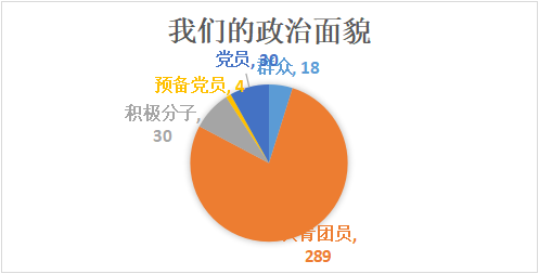 4、 萌新政治面貌:现在正在为揭秘的是萌新政治面貌,通过问卷数据分析得出我院萌新群众比例占4.85%、共青团员比例占77.9%、积极分子比例占8.09%、预备党员比例占1.08%、党员比例占8.09%。具体人数是群众18人、共青团员289人、积极分子30人、预备党员4人、党员30人。