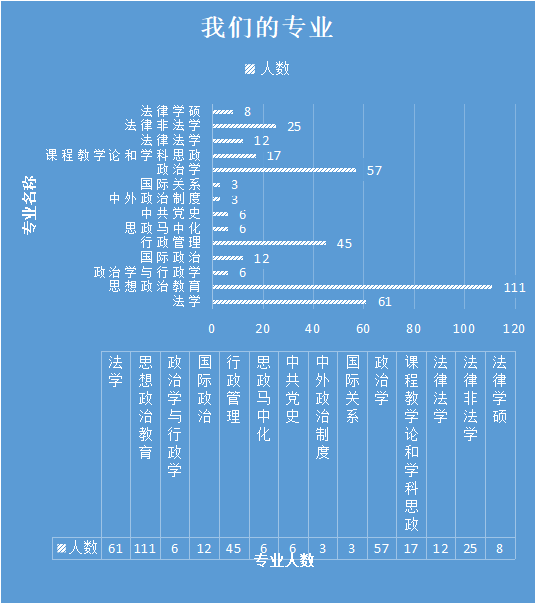 7、萌新们的专业:录取人数最多的五个专业分别是:思想政治教育(占29.92%)、法学(占16.44%)、政治学(占15.36%)、行政管理(占12.13%)、法律非法学(占6.74%)。