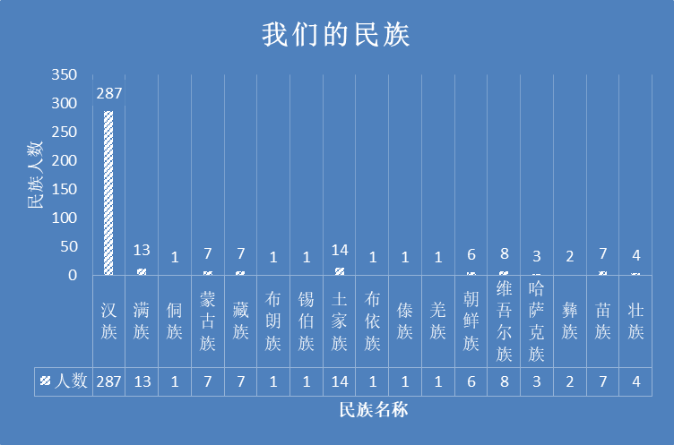 具体人数:汉族 287人 满族13人 侗族1人 蒙古族 7人 藏族7人 布朗族1人 锡伯族1人 土家族14人 布依族1人傣族1人 羌族1人 朝鲜族6人 维吾尔族8 人 哈萨克族3人 彝族2人 苗族7人 壮族 4人