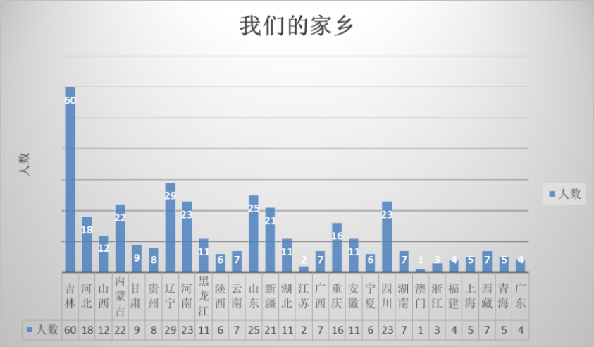 6、萌新家乡所在地:萌新都来自全国各地,家乡遍布全国各个省(直辖市、自治区、特别行政区),其中来至吉林省、辽宁省、山东省的同学是我院萌新的主力军。(老乡见老乡,两眼泪汪汪,一定是特别的缘分,才会选择东北师范大学相聚于政法学院,你不是孤单一个人)(五湖四海同聚一堂)希望你们都能在东北师范大学政法学院实现人生的理想、扬帆起航!萌新们现在是任由你们展翅高飞播撒青春热血的时候,未来三年、四年就是你们收获的季节,望你们都满载而归。下面是具体人数: