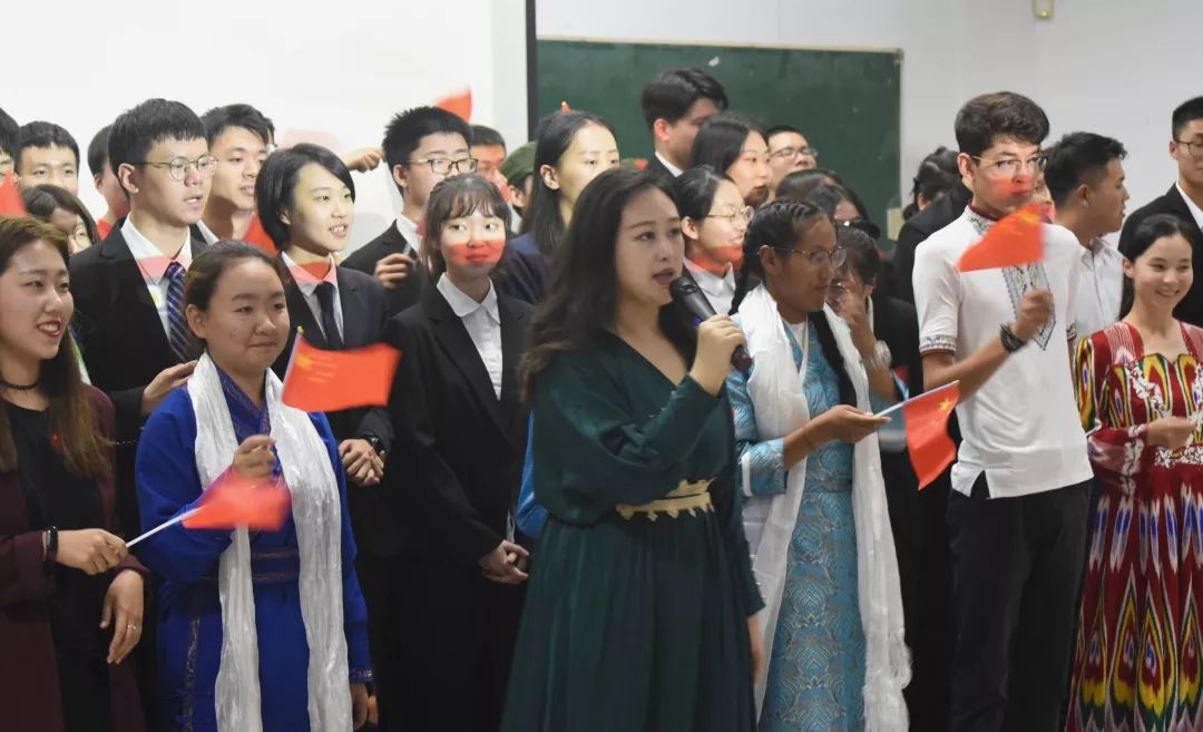 这一幕的结尾,政法学院学生会民族部带来合唱《红旗飘飘》,台上,身着各自民族服饰的同学们随歌起舞;台下,一面面小五星红旗正被热情挥舞。