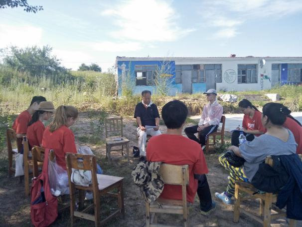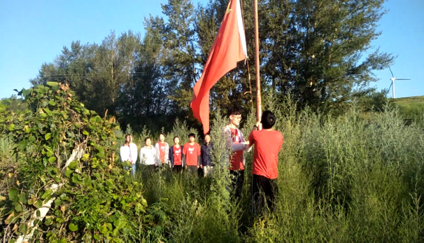 2019年7月21日东北师范大学常春藤科尔沁小队八名活动成员分成了三个小组,分别住进了自己的房东家里。房东们热情亲切,对同学们的到来十分欢迎。在经过了短暂的午休后,同学们于当天下午三点在示范区内和万平老师进行了第一次的近距离交流。同学们分别进行了自我介绍,让万平老师对同学们的基本情况有了大致的了解。在同学们介绍完后,万平老师给同学们讲述了他为什么选择这样一个地方开展了几十年的治沙工作。在听完万平老师的心路历程后,同学们受到了许多触动和启发,对接下来几天要开展的活动也有了更深层次的想法。三个小时在万平老师动人而饱含感情的讲话中很快就过去了,同学们带着收获和思考结束了第一天的活动,并且对接下来几天的活动充满了期待。7月22日清晨六点,同学们和万平老师准时在示范区内集合,准备进行升旗仪式。这也许是同学们一生中经历过的参加人数最少的升旗仪式,但也一定是经历过最有意义的升旗仪式。在同学们响亮的歌声中,五星红旗迎着太阳缓缓上升,在这一刻,大家心里同时涌上了浓浓的爱国之情。