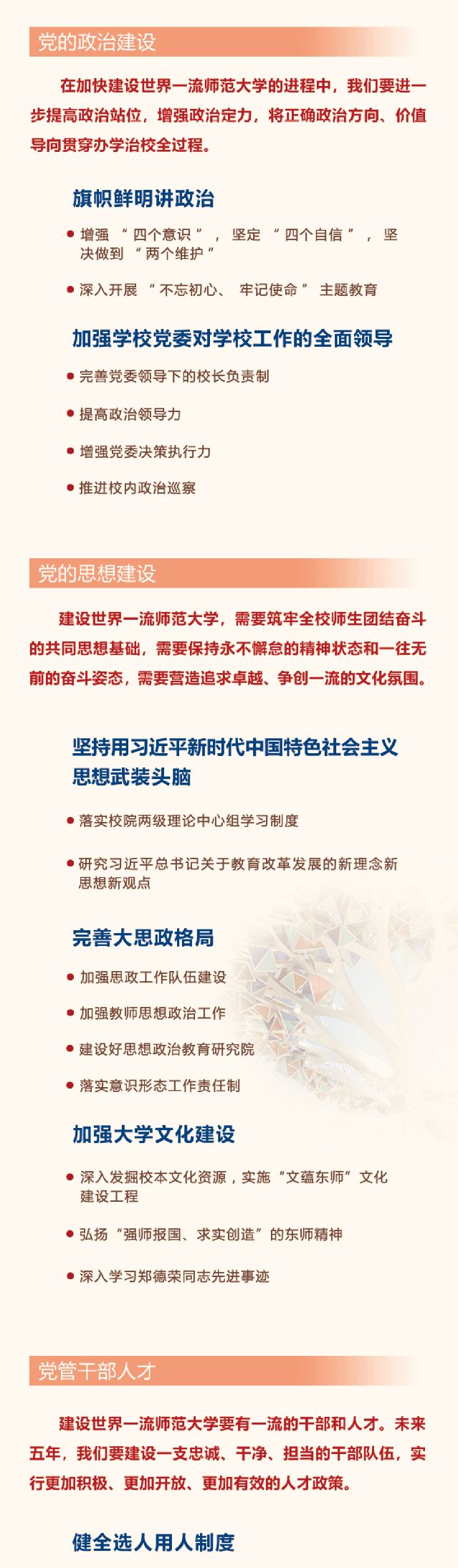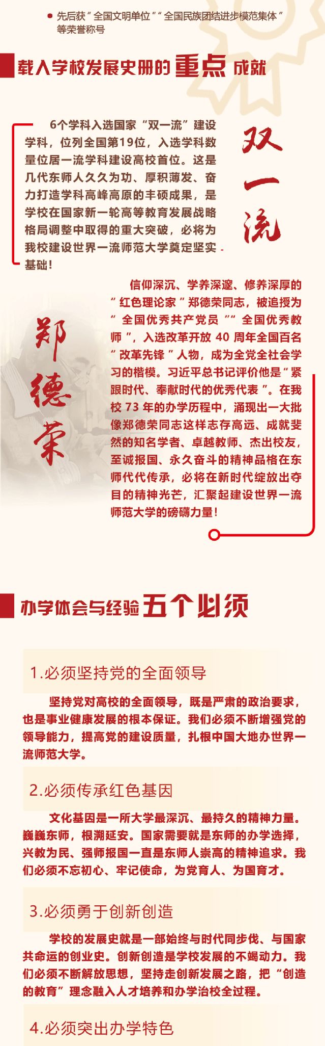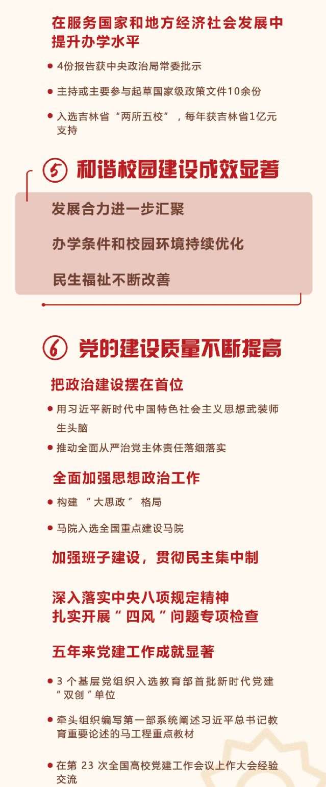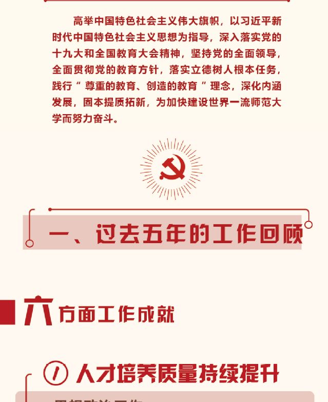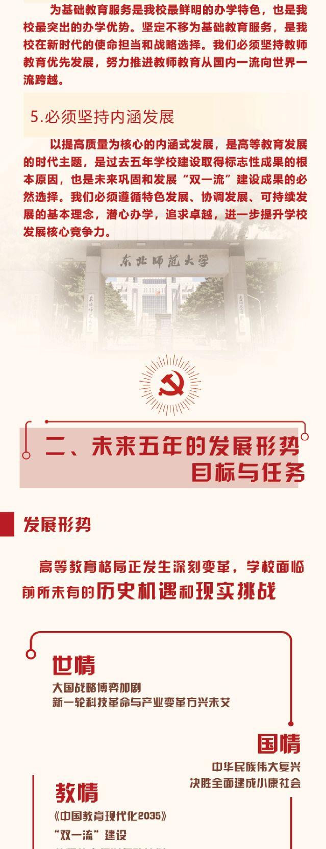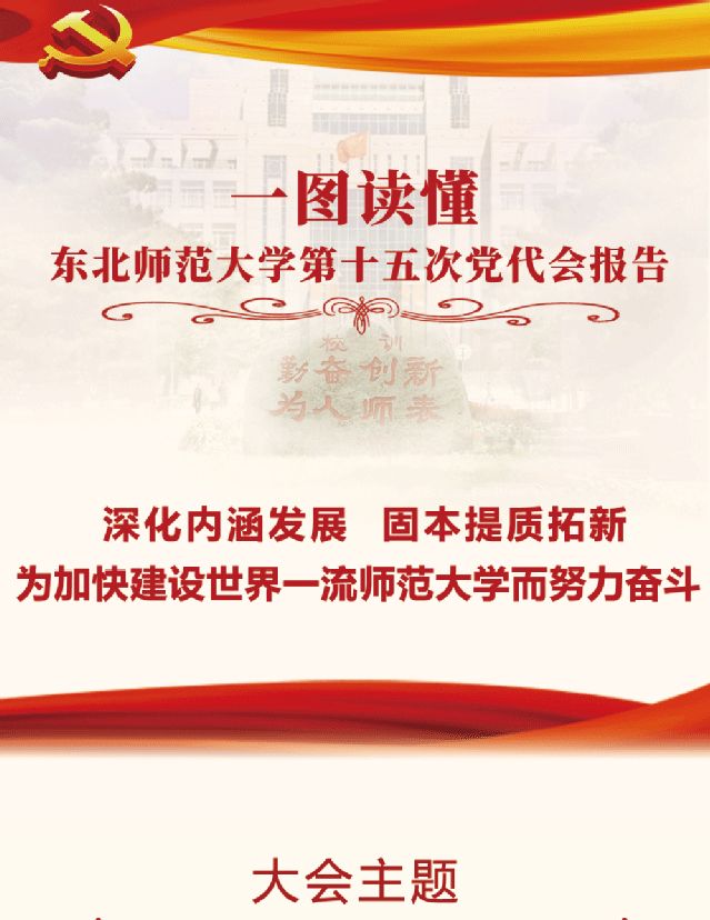 2019年6月25至27日,中国共产党东北师范大学第十五次代表大会胜利召开。本次党代会是在决胜全面建成小康社会、实现第一个百年奋斗目标的关键之年,在教育强国建设开启新征程、学校事业发展进入新阶段的重要时期,召开的一次十分重要的会议。杨晓慧同志在会上作的题为《深化内涵发展 固本提质拓新 为加快建设世界一流师范大学而努力奋斗》的报告,经过党代表们的深入讨论,已于日前修订完毕。党委宣传部用“一张图”的方式,围绕党代会报告的精神、内容、新提法、新亮点等,对党代会报告进行了解读。