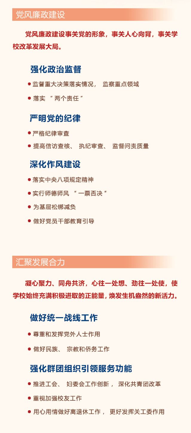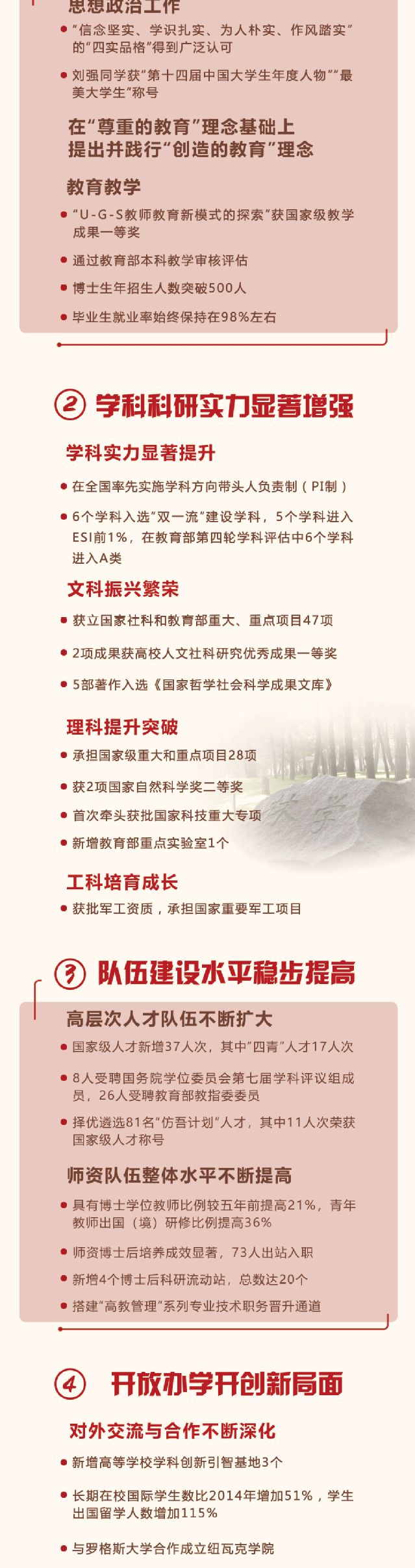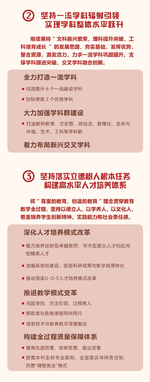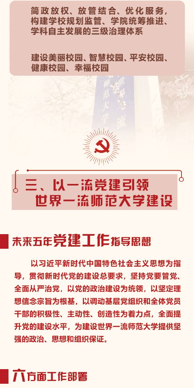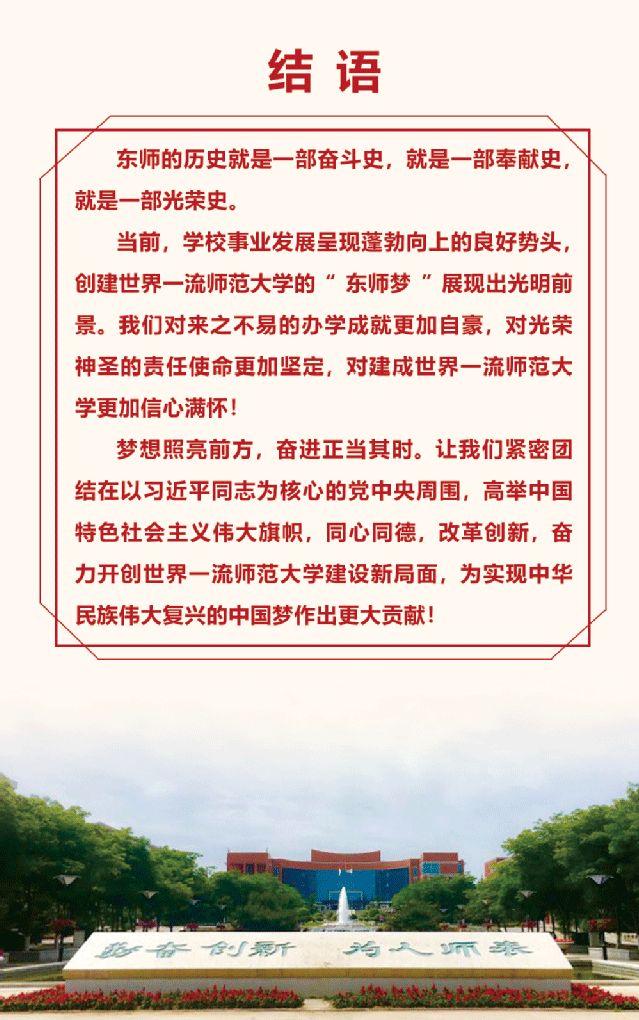 2019年6月25至27日,中国共产党东北师范大学第十五次代表大会胜利召开。本次党代会是在决胜全面建成小康社会、实现第一个百年奋斗目标的关键之年,在教育强国建设开启新征程、学校事业发展进入新阶段的重要时期,召开的一次十分重要的会议。杨晓慧同志在会上作的题为《深化内涵发展 固本提质拓新 为加快建设世界一流师范大学而努力奋斗》的报告,经过党代表们的深入讨论,已于日前修订完毕。党委宣传部用“一张图”的方式,围绕党代会报告的精神、内容、新提法、新亮点等,对党代会报告进行了解读。
