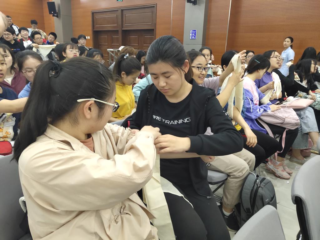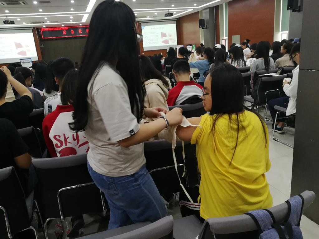活动一开始,副院长孟巍老师发表讲话,他告诫同学们在野外实习时,危险时刻在我们身边,我们应该保护好我们自己,掌握一些必要的急救方法。随后刘桂敏医生结合理论知识为同学们讲解了创伤救急,现场包扎等基本技能,同学们认真听刘医生讲解各种细节和要点,同时也学习了大量基础急救方法。理论知识讲解完毕后,进行了实践操作方面的培训,同学们两人一组,积极配合,互相做创伤救护,止血包扎练习,现场大家热情高涨,边听边记,表现出了极大的兴趣。