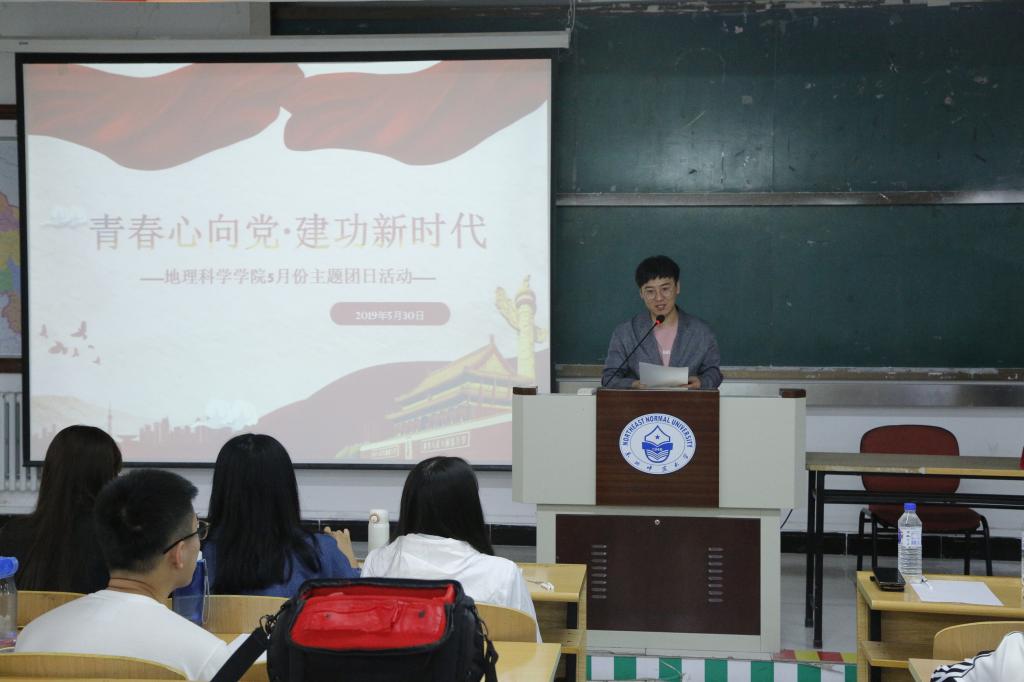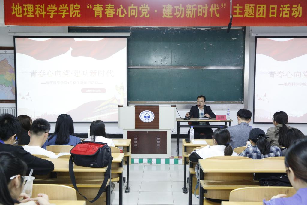 5月30日,地理科学学院团委组织部在地理大教室举办主题为“青春心向党,建功新时代”的团日活动。本次活动有幸邀请到了来自政法学院的张泽强老师担任主讲人,出席本次活动的嘉宾有地理科学学院2015级辅导员王玉老师、2018级辅导员张泽远老师。