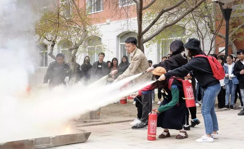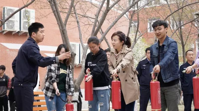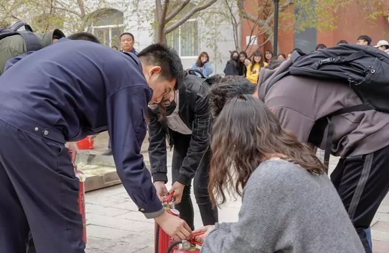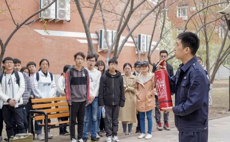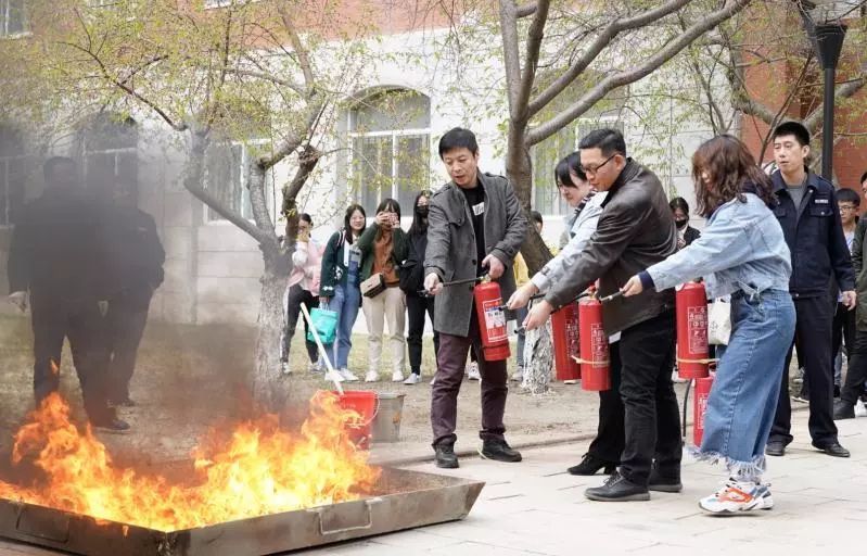 讲座后,王佑名老师带领同学们来到室外,讲解火灾现场的应急处置方案,说明灭火器的原理、基本操作方法及注意事项,并指导学生进行灭火器实操演练,帮助学生更直观的学习使用方法。
