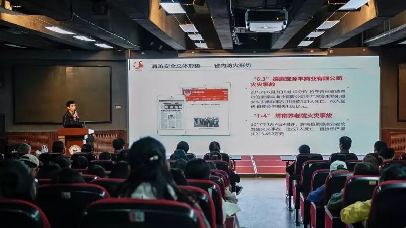 随后,保卫处王佑名老师从“消防安全总体形势”“火灾成因及其危害”“常见消防设备设施”“校园防火注意事项”等四个方面讲述消防安全知识,图文并茂,生动形象。通过列举真实案例,王老师警示学生在生活中需重点注意消防隐患,了解基本消防设施设备的使用方法,学会在紧急情况下正确使用。同时,学生还需在发生火灾时应学会合理自救,选择合适的逃生时机、逃生路线、避难场所,正确使用求救信号。