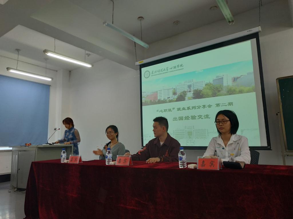 “心职讯”就业系列分享活动之出国经验交流会于2019年5月9日下午15:30,在心理学院430圆满举办。出席本次活动的嘉宾有心理学院2015级苑启明学长、陈雪晴学姐和罗颖学姐,以及本科生30余名。