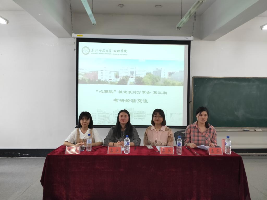 心理学院2016级心理班为帮助学生了解心理学就业形势、促进学生确立有效的职业发展目标,邀请已经就业的前辈进行经验分享;针对本科生考研保研出国等深造情况,邀请学院毕业年级学生指导大三学生备考技巧、注意事项等,给予大三学生帮助。心理学院2016级心理班班委于2019年5月共设立保研、出国、考研和就业等4场经验分享会,下面请看详细报道: