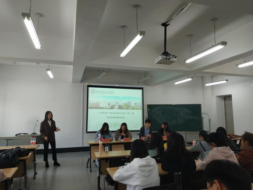 学姐们主要讲述她的复习程序,提醒大家好好学习专业课,调节好心态,保证整个考研期间目标坚定,以及针对我们的具体问题进行解答,详细地讲解东师心理学的面试流程以及一些注意事项,指出了英语的重要性,为大家提供切实的指导,也详细介绍自己复习期间的时间规划,同时也为大家推荐优秀实用的网络课程、书籍和微信公众号,给我们提供是实质性的帮助。分享过后,同学们积极提问,现场气氛热烈,反响良好。