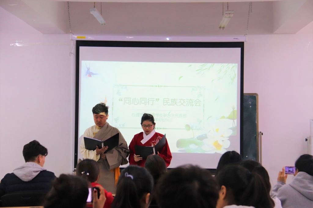主持人张茜(满族)和平措扎西(藏族)两位同学身着民族服装,通过声情并茂的讲解,热情开场。