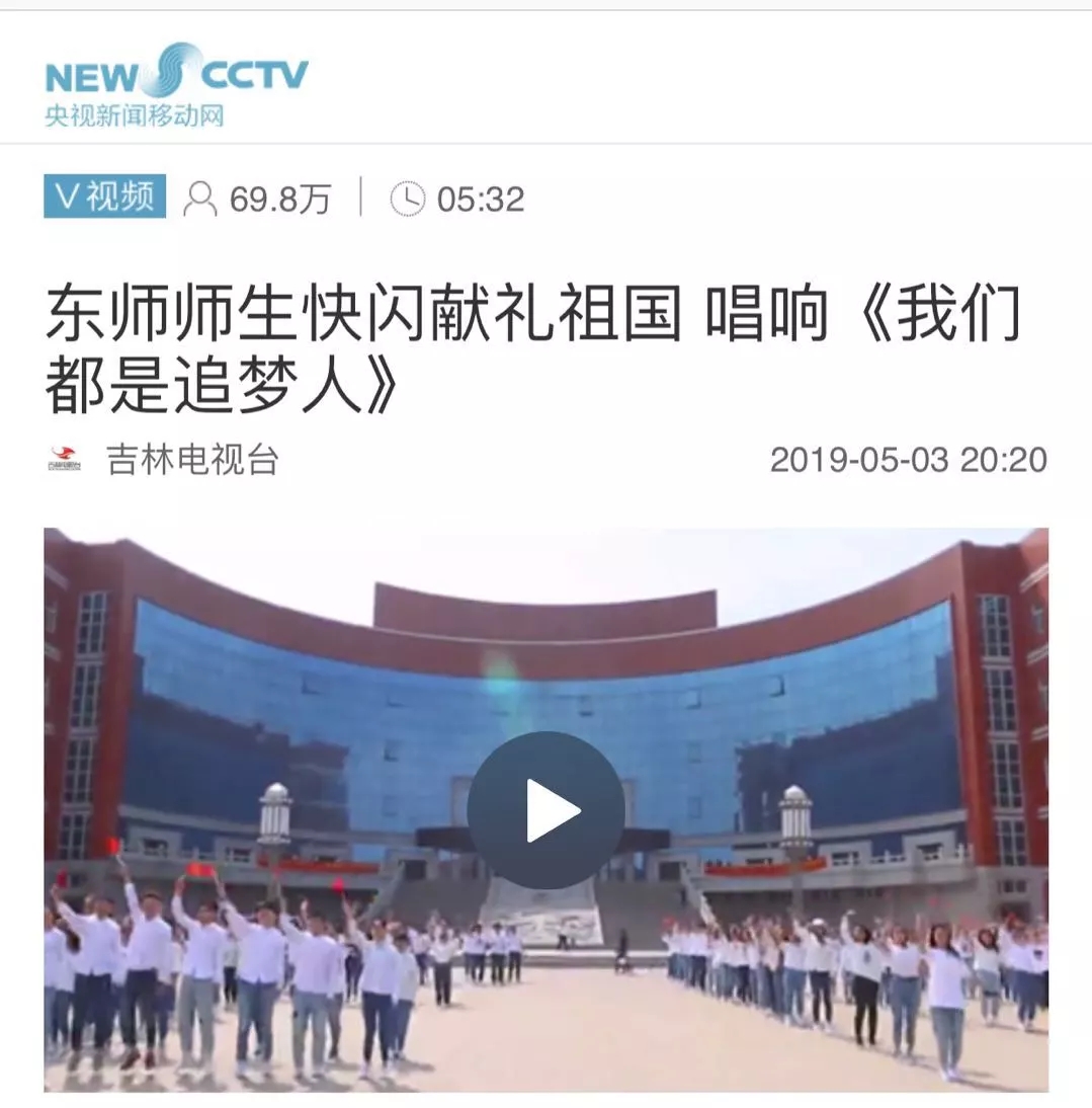 为庆祝新中国成立七十周年及五四运动一百周年,近日,我校传媒科学学院(新闻学院)拍摄了充满青春活力的《我们都是追梦人》快闪MV。该视频经“东北师范大学”官方微信公众号和“东师传媒”微信公众号推送后受到师生的广泛赞誉。学习强国客户端、中国央视新闻移动网、吉林电视台进行了宣传报道和同步转载。