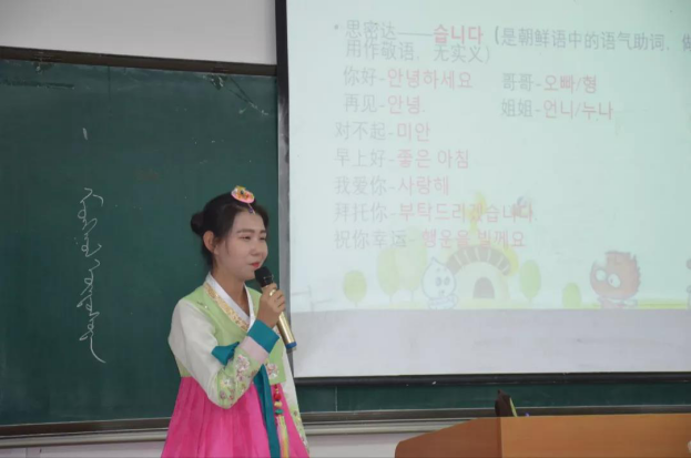 黄朱英,朝鲜族,她向大家介绍了我们十分感兴趣的朝鲜族文化,教大家学习朝鲜族语言。