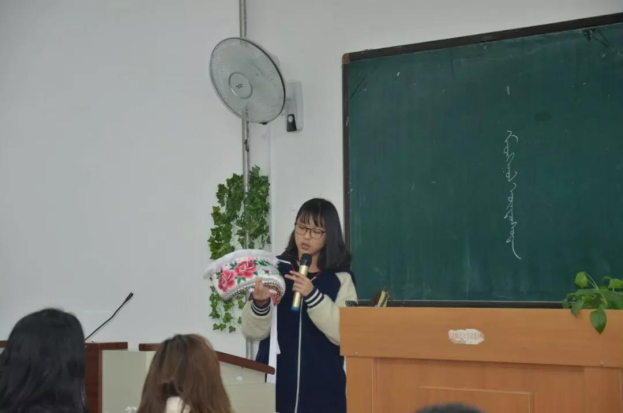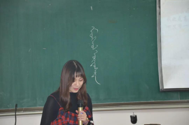 王旋,蒙古族,她在黑板上写下了隽秀的蒙古族文字,同时介绍到她们民族特色的节日、美食、服装、观光景点等,让我们了解到了我们以往不知道的蒙古族习俗!