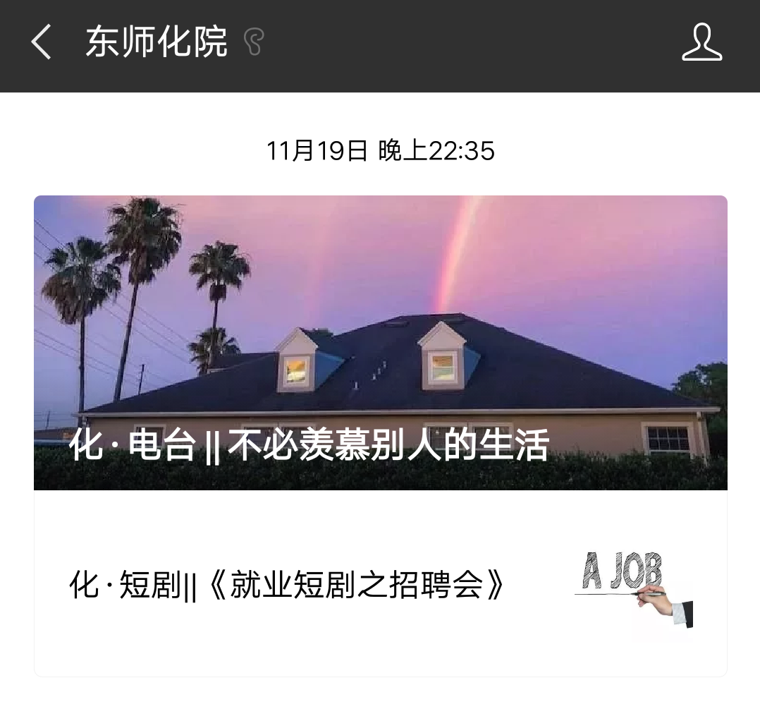 2018年11月4日、12日、19日、25日,在“东师化院”微信公众号推出了四期电台。电台主题分别为,“活成你喜欢的样子”、“让心回到最初的地方”、“不必羡慕别人的生活”以及“他们从不曾离去”。有励志、有温暖、有感动也有思考。