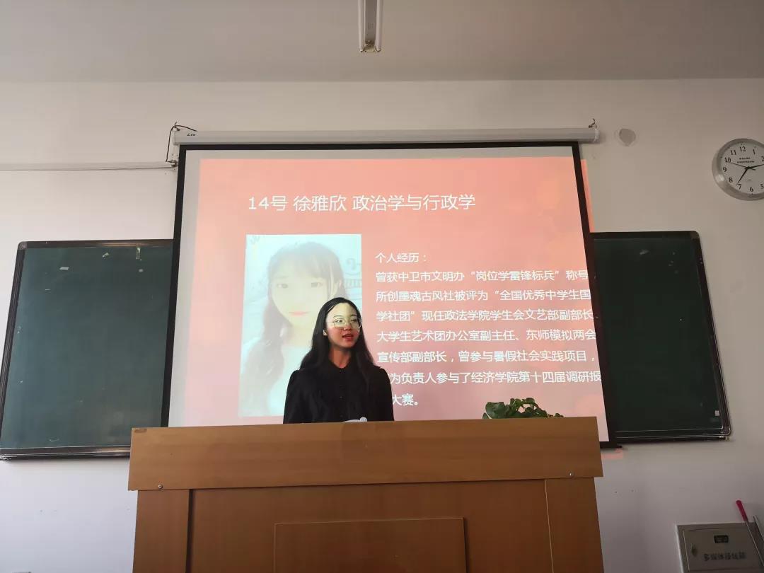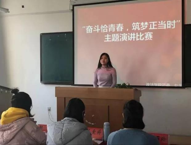 11月18日下午1点30,政法学院“奋斗恰青春,筑梦正当时”主题演讲比赛在我院政九教室成功召开。本次比赛由政法学院学生会学习部部长王蕾淋、政法学院学生会体育部部长王兴进、政法学院学生会女生部部长邹冉、政法学院团委社团指导部部长陈爱婷、政法学院团委社团指导部部长邵丽玲担任评委,参赛的同学分别来自2017级和2018级,共计27人参加。