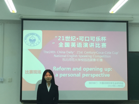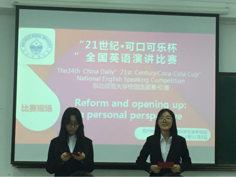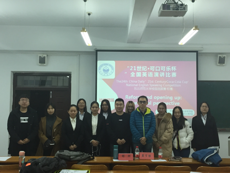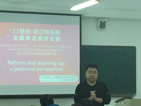 2018年11月9日晚6点,由东北师范大学净月校区外国语学院第四十三届学生会学研部承办的“21世纪·可口可乐杯”全国英语演讲比赛于外国语学院406-1教室举办。外国语学院电子商务系程刚老师,姜言胜老师作为评委莅临本次比赛。