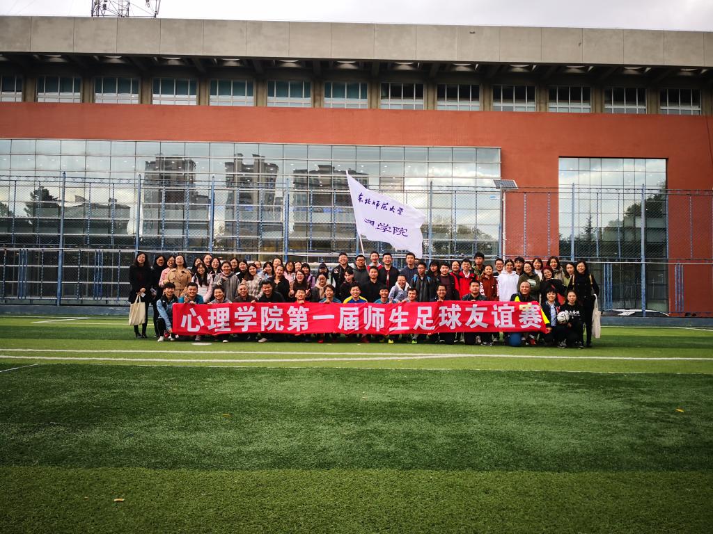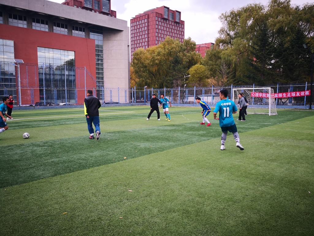 10月26日,由心理学院团委举办的心理学院第一届“师生足球友谊赛”圆满结束,心理学院以院长盖笑松为首的6名教师和5名学生球员参加了比赛,百余师生齐聚北苑绿茵场加油助威。