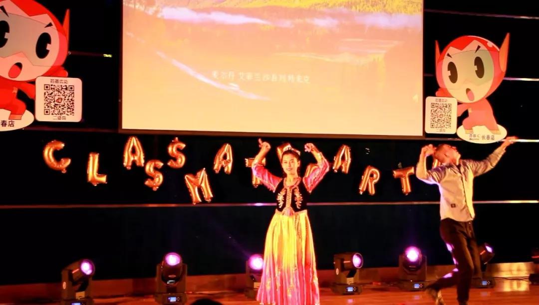 四位新疆同学为我们带来了极具民族特色的新疆舞蹈。两男两女,双双成对,用轻巧灵活的舞姿和娴熟的技巧向我们展现了新疆舞的魅力。他们热情奔放,笑容灿烂,给我们带来听觉与视觉的双重享受。未来的大学四年里,无论我们来自哪里,我们都要互相帮助,坚持民族团结,我们都是中华民族的儿女。