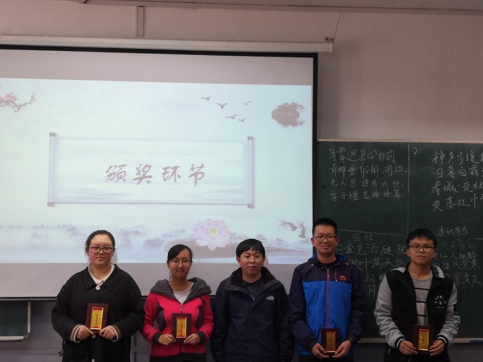 大会一共有六个环节,分别是风采展示,抢答题,选字和成诗,飞花令,五分钟作诗和知识竞赛。最后评委进行了打分及精彩的点评。通过激烈的角逐,六班摘得桂冠,位列其后的分别是五班和四班,一班的万知非同学获得了优秀个人奖。