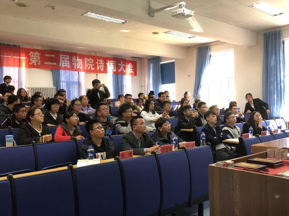 2018年10月17日,为了激发物院学子对诗词的热情,学生会女生部在物院101教室举办了第二届物院诗词大会。大会邀请了多位对诗词有着独特理解的嘉宾及评委对比赛进行点评。