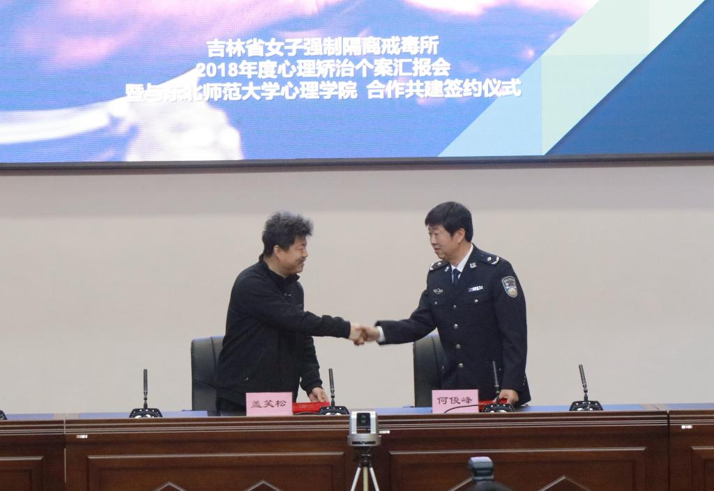 为全面落实全国教育大会精神,“以本为本”全面加强本科教学工作,为人才培养搭建实践平台,促进心理学科学研究成果转化,实现心理学学科建设服务社会发展的目标,近日,心理学院与吉林省女子强制隔离戒毒所签署合作共建协议,充分利用双方的优质资源,合作共建“东北师范大学心理学院教学科研实践基地”。我校心里学院院长盖笑松,吉林省女子强制隔离戒毒所所长何俊峰,禁毒所民警及心理学院部分师生参加了活动。