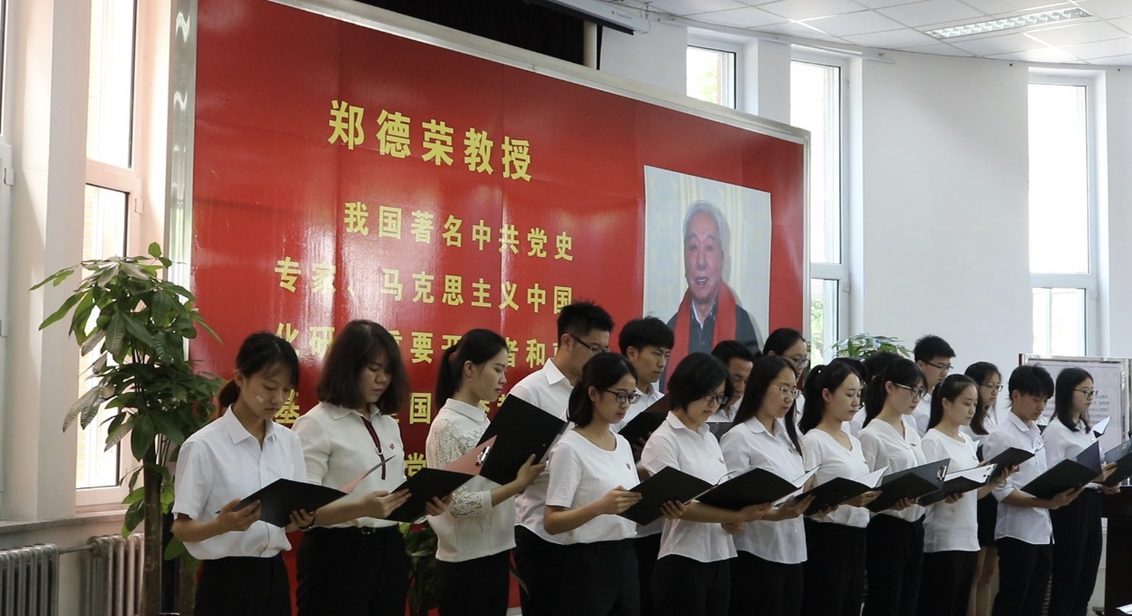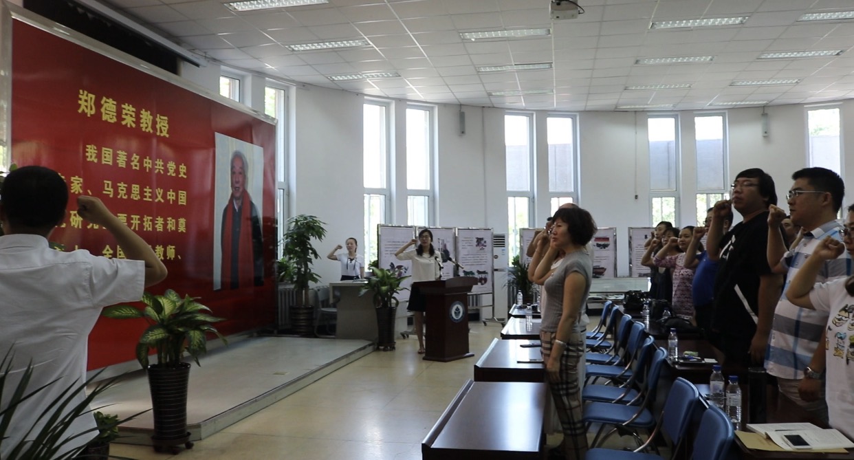 在活动最后,由李行老师带领全体党员重温入党誓词,感受不忘初心,牢记使命的责任担当。全体党员起立,奏《国际歌》,并由吉喆老师带领大家观看纪念郑德荣先生主题展板,为我们生动形象地讲述了郑先生的生平事迹和光荣岁月。