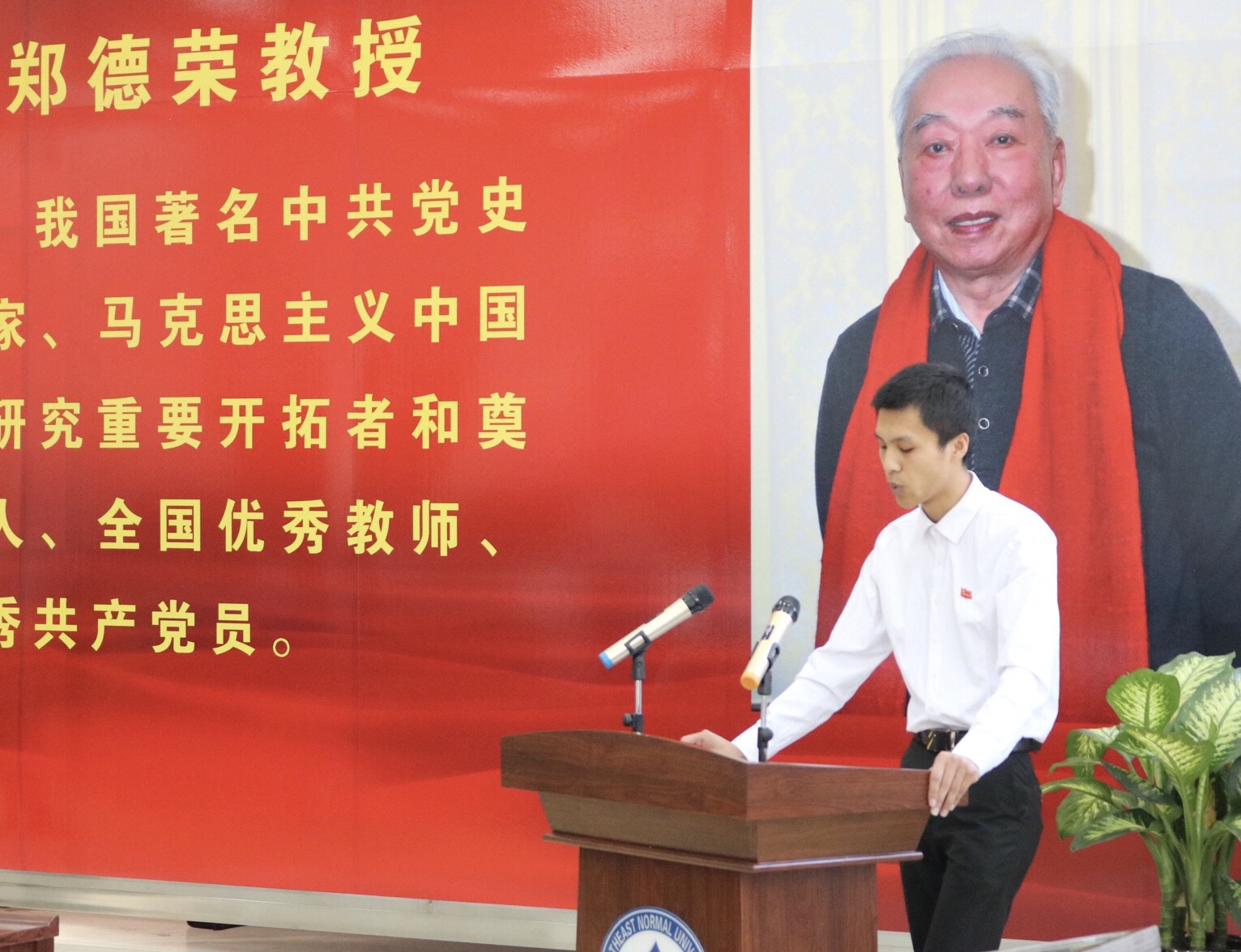 学生党员代表刘强以“伟大”二字入手,通过缅怀伟大、致敬伟大、走向伟大和问鼎伟大四个层次告诉我们在中国共产党成立97周年的当今,更应学习郑德荣先生风范,承担起中华民族伟大复兴这一使命。