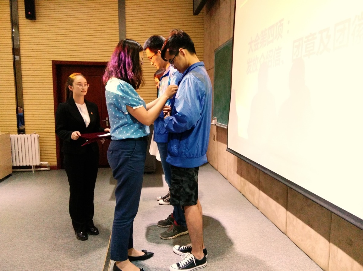 会议第四项,发放介绍信及团徽。团委书记王隽媛老师为学院三个不同专业班级的同学代表发放了介绍信及团徽,使大家深刻体会到作为共青团员的担当与使命。