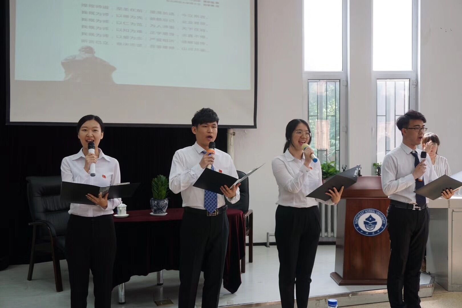 活动最后,由学生党员代表朗诵东师原创曲目《师德公约》。将师者仁心、大爱师魂的精神从先生这里传承下来,发扬光大。