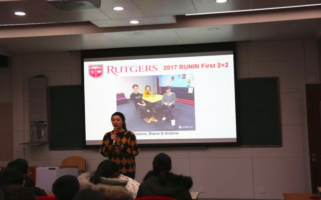 首先,安晨和于墨彤分别向学生们介绍了出国前的准备,在美国的衣食住行,罗格斯大学选课及毕业学分等问题,并针对人际交往、确保人身财产安全等问题提出了一些建议。通过在美国的学习与生活,安晨与于墨彤为大家总结以下三点心得:独立自主的生活能力;自学与合理安排时间能力;善交外国友人的能力。