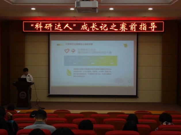 本次活动主要分为两个部分,首先是由团委科研部部长汤题为参与科研的同学们介绍他们可以参与的各种赛事,以及学院历届参与获奖项目的基本情况,还邀请到了常春藤协会会长李腾为大家讲述他参加公益创业比赛的经验和方法。