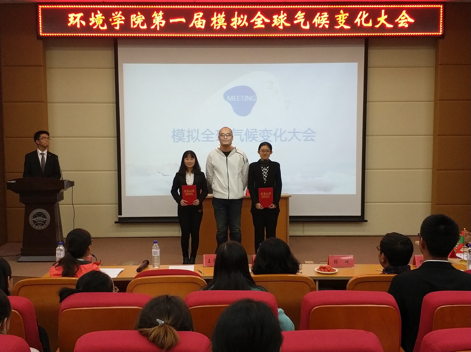 环境学院模拟全球气候变化大会于2017年10月29日14:00在环境学院203报告厅成功举办。本活动由环境学院学生会主办,邀请了环境学院团委书记王隽媛老师、生态学系王肇钧老师、环境科学系曹勇宏老师、2016级辅导员杨屹老师以及研究生会主席杨丰铭学长出席了本次活动。