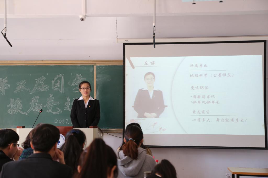 4月9日上午,地理科学学院第五届团委换届竞选会于学院二教室成功举办。竞选产生了第五届团委新成员,这标志着地理科学学院第五届团委换届工作圆满结束。出席竞选会的评委有学院团委书记沈雯老师、2015级辅导员房栋老师、2016级辅导员张婧宁老师以及第四届团委副书记和各部门部长。