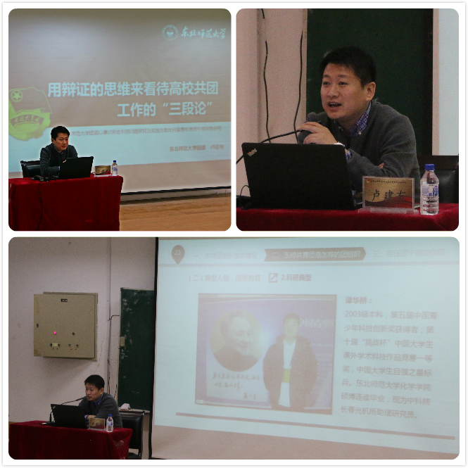 为让团学干部深入了解东师共青团的基本架构,加强团组织的凝聚力,为党校培养合格的入党积极分子,我院隆重举办团课第二讲“用辩证的思维来看待高校共团工作的三段论”专题讲座。此次活动,我院荣幸地邀请到东北师范大学团委副书记、组织部部长卢建有老师担任主讲嘉宾。卢老师从东师共青团的基本情况、组织建设以及加强学生干部培养等三个方面进行讲解。卢老师首先向学员明确了共青团的部门职能,强调应合理建设班团关系;接着展示了东师共青团辉煌的曾经,介绍在政治、教育和创业等领域有突出表现的学习典范;然后着重强调应加强团学干部自身综合素质的培养。团学干部要以人格的魅力、学习的楷模、工作的典范这三条标准严格要求自己,并提升自己的基本工作力、亲和力和思想力,做到思想强大,从容面对问题,自信处理问题。最后,卢老师对我院学生给予厚望,希望我院学生能以扎实的专业知识,打造具有学院特色的品牌性活动,为学院取得荣誉和表彰。讲座之后,团委组织学生党员和团员观看了《镜鉴》警示教育片,警示和教育学员要牢记共产党员的标准,坚持廉洁从业,从自己做起,从细节抓起,真正做到讲党性,重修养和树形象。