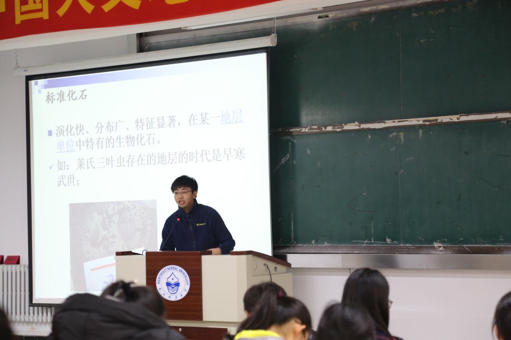 首先,王兴安老师以如何确定岩石的年龄为主题,从用大化石和同位素测年技术来确定地球上岩石的年龄两方面进行介绍,让同学们深层次地了解到如何确定岩石的年龄。之后张明明老师以地史上最大的生物灭绝事件为主题,按照生物的灭绝先后顺序介绍了一些在特定时间灭绝的生物,讲述了小撞击与大撞击对生物灭绝的影响。在讲座的最后,老师说明了生物多样性的研究和保护是我们地理人的责任,激发了同学们的兴趣。