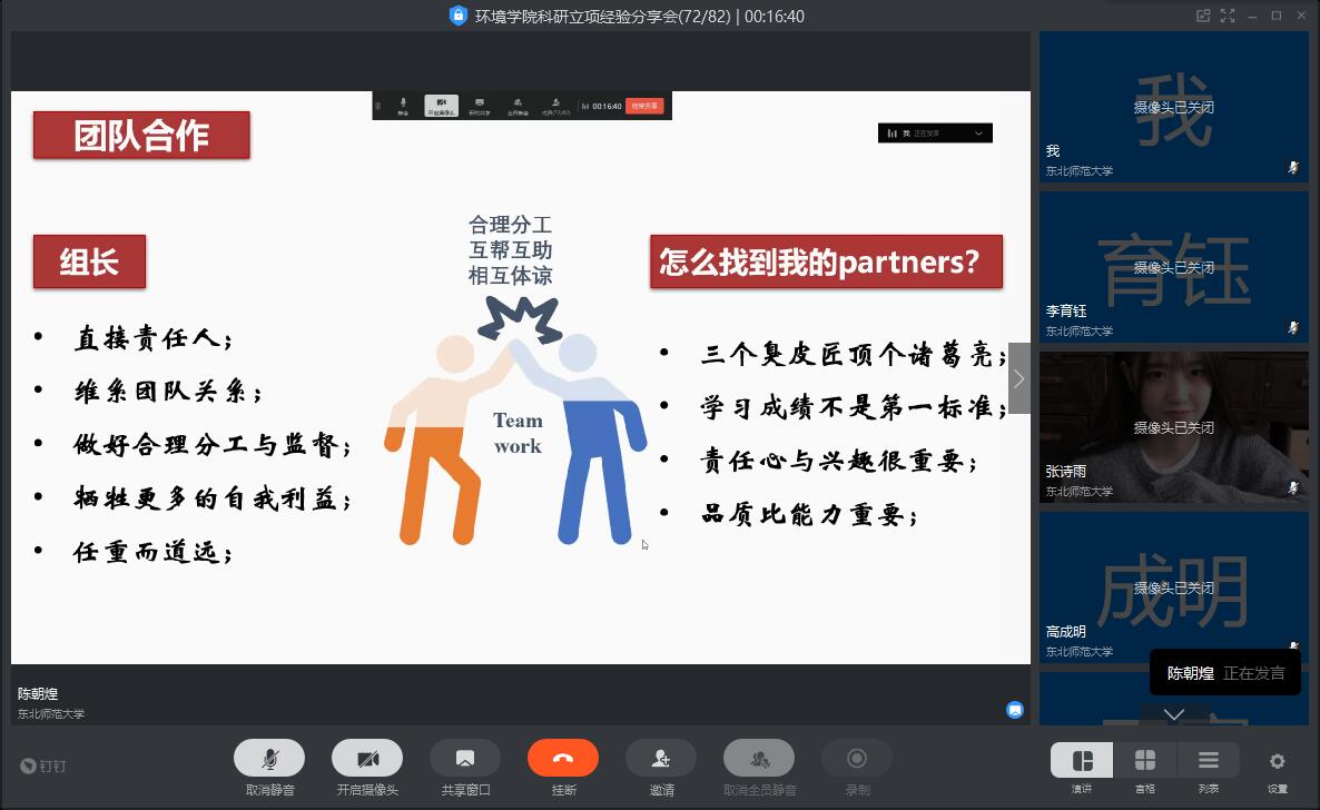 首先,由陈朝煌学长为大家解答科研实验中常见的问题并且简单地介绍科研立项流程。陈朝煌学长拥有丰富的科研经验,为了鼓励大家积极参与科研,他列举了做科研可以给我们带来的益处。学长也结合自己的经验为科研项目负责人提出了许多建议:维持良好的团队关系,在科研实验中做好合理的分工和监督,并且自己多承担一些责任等等。除此之外,学长也强调了导师对科研项目推进的重要作用,进而阐明参加导师组会的重要性。分享的最后,学长激励我们:既然选择了远方,便只顾风雨兼程!