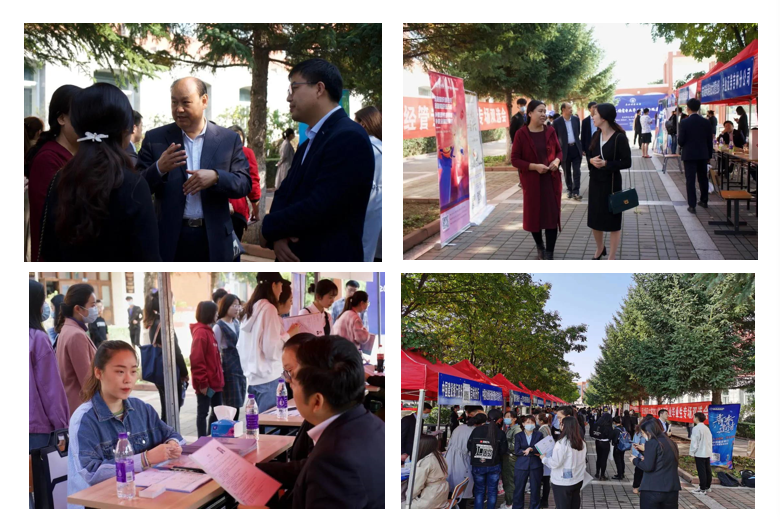 学生就业指导中心主任王娜及学院党委书记房国忠、院长吕康银、党委副书记赵建立来到双选会现场,与用人单位亲切交谈,了解用人单位需求,并为现场学生解答疑问。