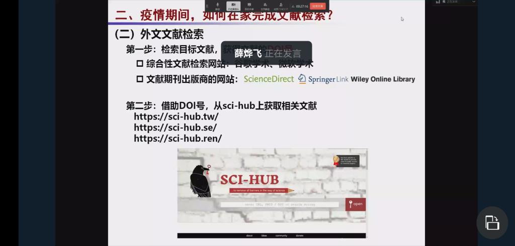 上午9:30,由主持人宣布培训活动正式开始。本次培训会,主讲人薛烨飞师兄结合同学们“宅家读文献”的实际需要,主要详细讲解了“文献检索的基本方法”以及“疫情期间,如何在家高效检索文献”这两个问题。