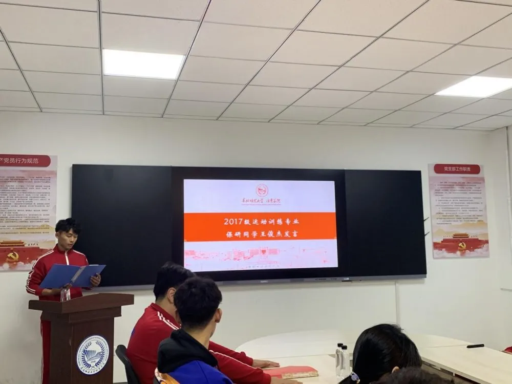 2017级体育教育专业保研同学岳程煜进行发言,他首先简单向大家介绍了保研的含义与考评形式,结合自己校内、校外的学习经历,向同学们分享了自己如何对时间进行合理的安排与分配。