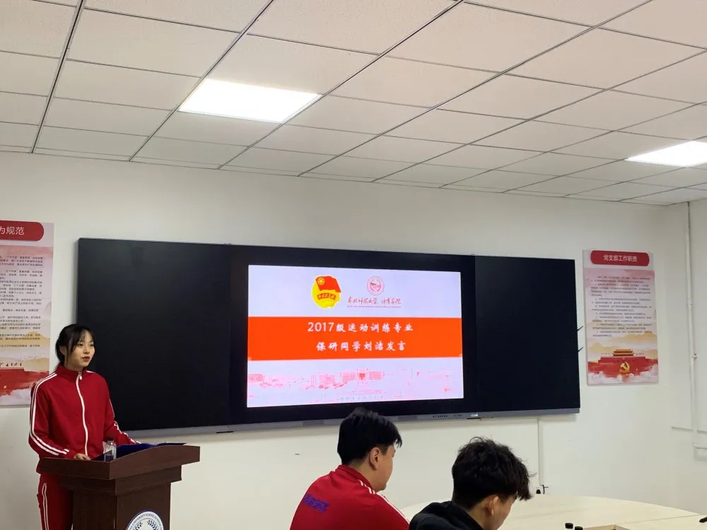 2017级运动训练专业保研同学刘洁进行发言,她首先简单向大家介绍了保研的含义与考评形式,并讲述自身三年来的训练与学习经历,向同学们分享了自己如何对时间进行管理。她表示,有志者事竟成,脚踏实地终能实现理想。
