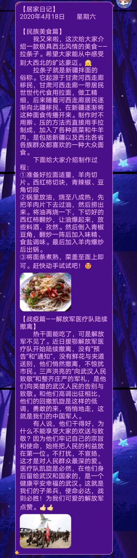 由于疫情原因,本次活动在线上通过各年级群为大家呈现。学生会各部门每天提供具有部门特点的材料,生活部提供实时疫情信息,最后生活部统一排版后由各年级负责人发送至年级群。在《居家日记》内容方面,主要有两部分组成,一部分由学生会各部门为大家提供学习资料、办公技巧、体育运动和民族特色展示等方面的内容,另一部分为大家提供实时疫情信息和分享战疫过程中的感人点滴。