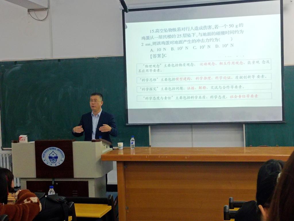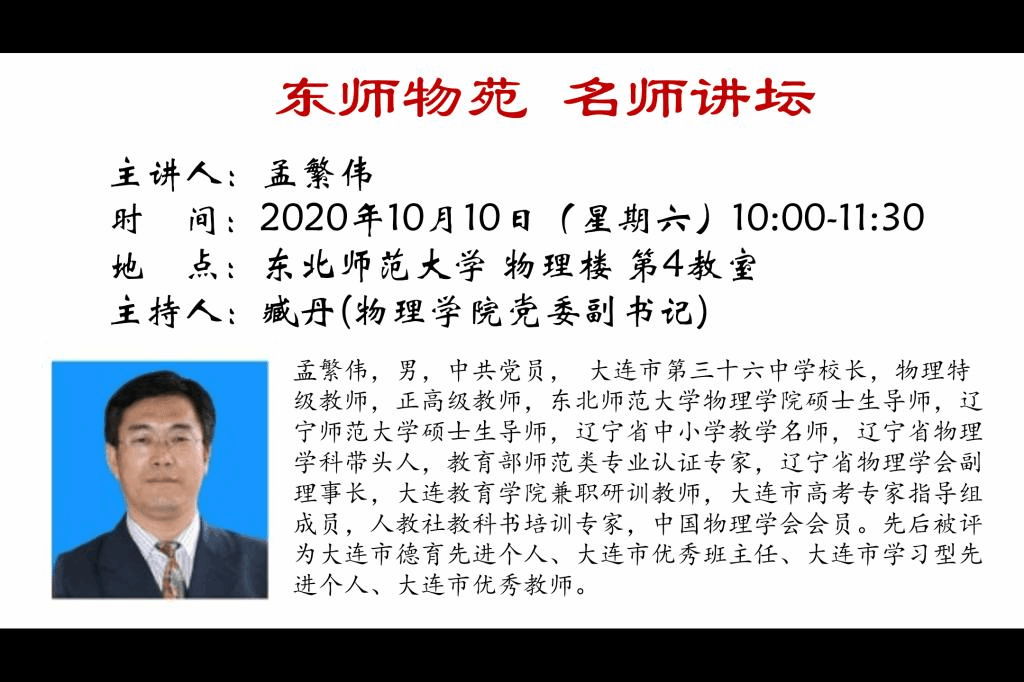 2020年10月10日,“东师物苑 名师讲坛”活动在学院116教室成功举办。本次活动很荣幸邀请到了大连市第三十六中学校长、物理特级教师、正高级教师孟繁伟担任主讲嘉宾,学院党委副书记兼副院长臧丹、课程与教学论教研室教师于冰、学院教育学方向硕士研究生、各年级公费师范生共计100余人参加活动,活动由臧丹主持。