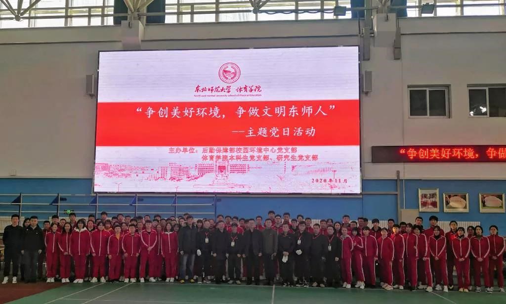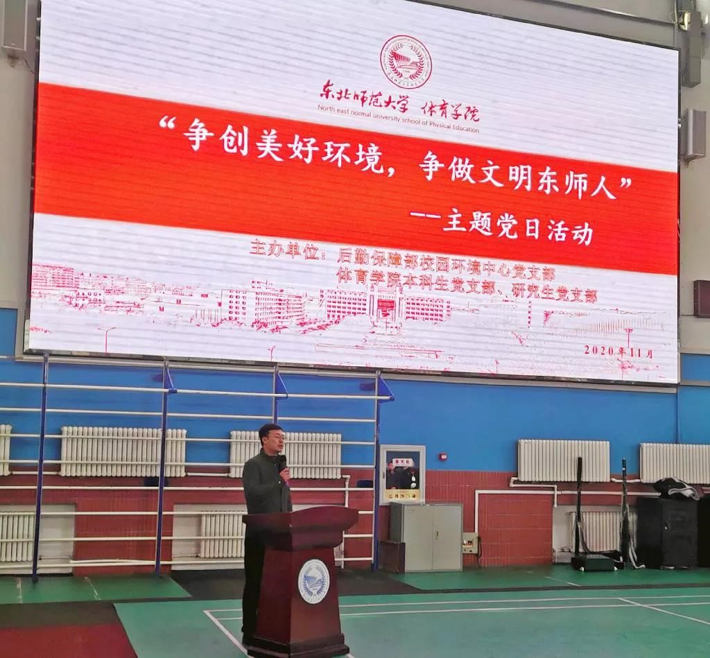 为贯彻落实中共中央、国务院下发的《关于全面加强新时代大中小学劳动教育的意见》,东北师范大学体育学院本科生、研究生党支部联合后勤保障部校园环境中心党支部于11月4日中午12:00,在体育学院田径馆举行了“争创美好环境,争做文明东师人”主题党日活动,后勤保障部党委副书记张昆仑老师、体育学院党委副书记兼副院长常益老师、后勤保障部校园环境中心党支部书记张海军老师、后勤保障部校园环境中心党支部各位老师、体育学院学生工作组的各位老师以及体育学院部分研究生、本科生同学参加了本次活动。