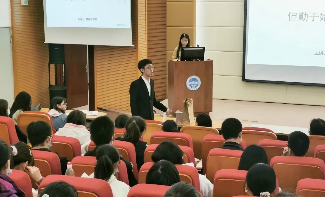 本次活动于上午10点开始,由学院团委副书记祝玮泽主持。活动分为两个部分。首先,我校学生会主席团候选人,来自经管学院的杨权诚学长向我们做了题为“但勤于始,无悔于终”的演讲,学长向我们分享了他这三年来的学习经验,演讲分为“担当”、“创新”、“反思”等几个部分,提醒我们努力学习,要做到成绩优异,并且要热心帮助同学,做一名优秀的学生干部。