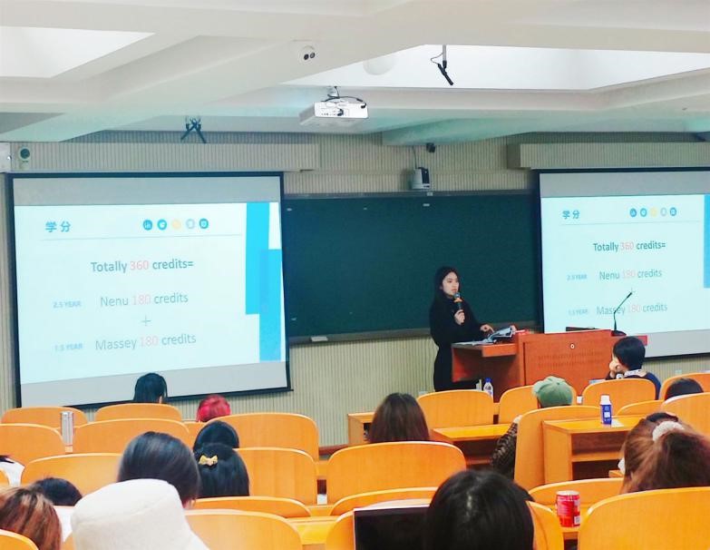 随后,学院外事秘书史新鹤老师对学院预举办的新西兰梅西大学2.5+1.5本科项目进行了详尽介绍,包括新西兰概况、梅西大学环境、入学要求、课程设置、费用等。