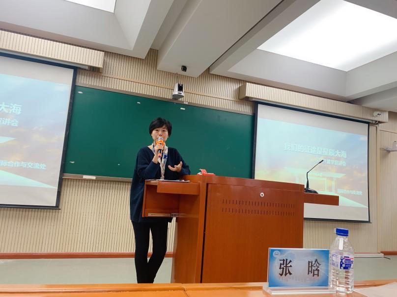 在建立与外方友好合作关系的过程中,学校国际合作与交流处各位领导也给予学院极大的支持与帮助。出国留学科科长张晗老师首先讲述了留学之于国家以及个人的意义,并对国家、学校以及经管学院的留学数据做了详尽分析;其后对学校留学项目进行介绍,包括短期项目、校际交流、双学位留学、联合培养、中外合作办学、线上课程等;学校提供的留学政策,包括公派留学奖学金政策、学生出国(境)交流专项资助、留学基金委资助、国际外语水平考试资助等,均在不同程度上,为学生出国留学提供了支持与保障。
