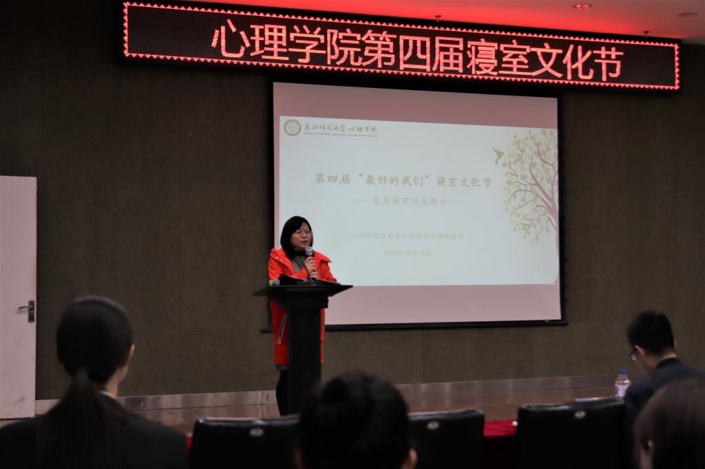 心理学院党委副书记兼副院长郭庆童老师参加活动并发表讲话,她向同学们介绍了我院近期工作情况,表达了对同学们的期待,希望各年级能够团结合作,加强寝室建设,共建寝室文化。